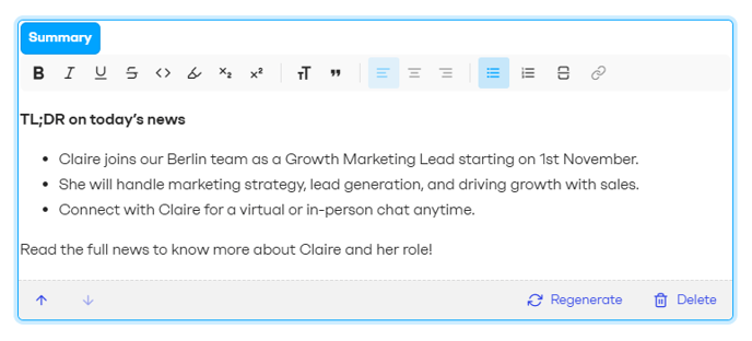 To refresh the content, click “Regenerate” in the bottom toolbar. This replaces the existing text with a new AI-generated summary.