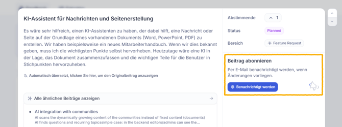 Hier werden Ideen eingereicht und diskutiert. Du kannst eigenes Feedback teilen, bestehende Anfragen durchsuchen, für Ideen abstimmen, Posts folgen und dich an Diskussionen beteiligen.