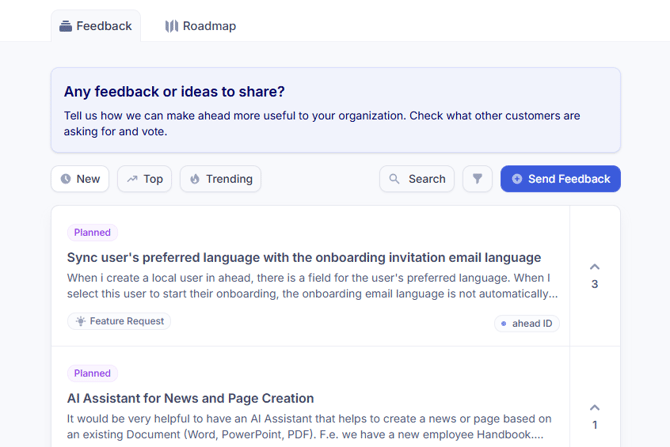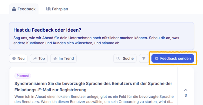 Teile Ideen, sieh dir an, was andere Kund:innen anfragen, und verfolge, wie sich dein Feedback von der Idee bis zum Release entwickelt. Das ahead Feedback & Roadmap Portal zeigt dir transparent, woran wir gerade arbeiten.