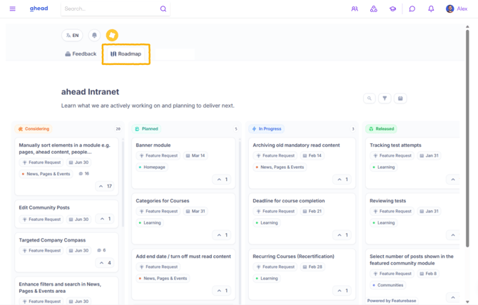 Das ahead Feedback & Roadmap Portal ist der zentrale Ort für Produktfeedback und Feature-Wünsche. Hier kannst du Ideen einreichen, bestehende Anfragen anderer Kund:innen einsehen und verfolgen, wie sich Feedback von der Anfrage bis zum Release entwickelt.