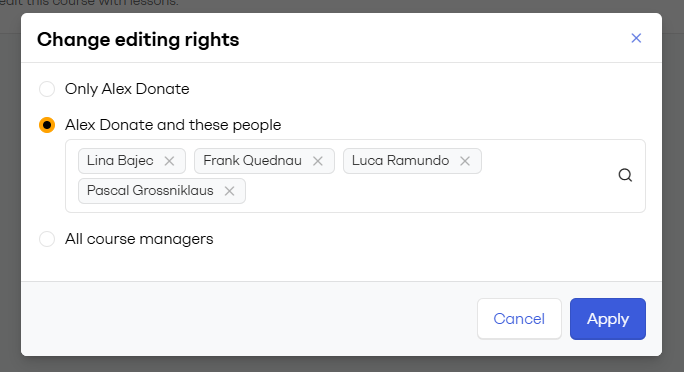 Control who can edit course content, manage participants, and view analytics by assigning course edit rights to selected users.
