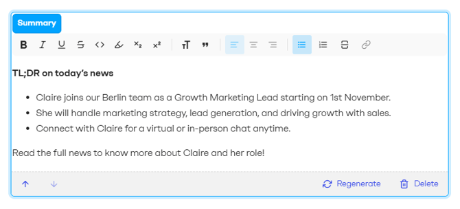 Um den Inhalt zu aktualisieren, klicke in der unteren Symbolleiste auf „Neu generieren“ – die bestehende Zusammenfassung wird dann durch eine neue ersetzt.