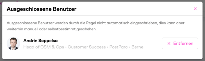 - Dort siehst du die Liste aller ausgeschlossenen Teilnehmenden. Mit einem Klick auf „Entfernen“ kannst du die Ausschlussregel für eine Person jederzeit wieder aufheben.