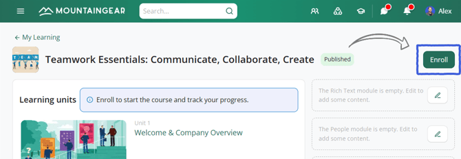 Sobald sie eingeschrieben sind, wird ihr Fortschritt automatisch verfolgt, und sie haben Zugriff auf Lektionen und Tests als Teil ihres Lernwegs.