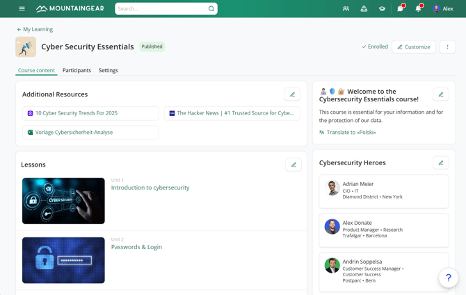 Course content tab: The core of the course. Contains all learning units (lessons and tests). Courses have Hub capabilities, allowing you to add modules such as Resources, People, or Featured communities to enhance the learning experience.