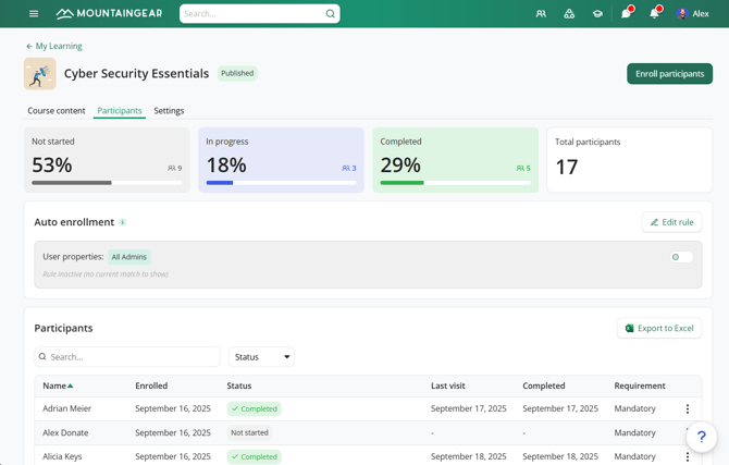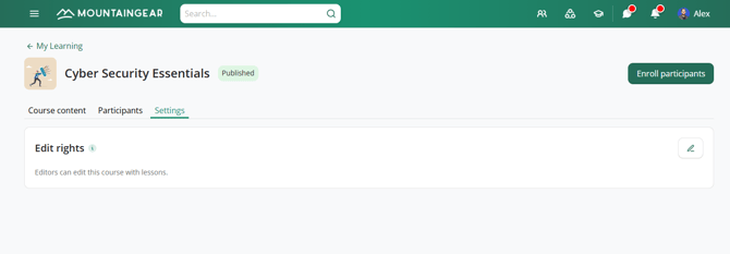 Participants tab (Visible to course editors): Used to enroll people and review analytics on participants’ progress.